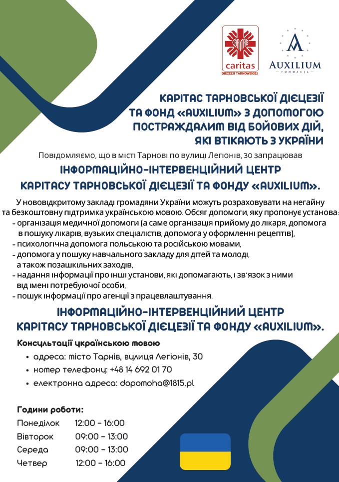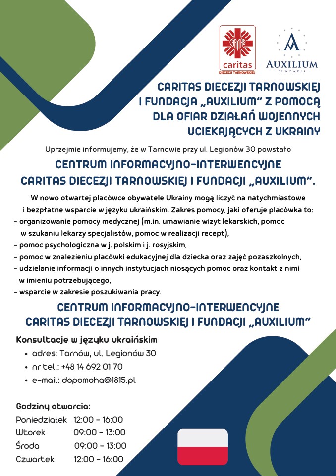 W naszej diecezji - w Tarnowie przy ul. Legionów 30 - działa CENTRUM INFORMACYJNO-INTERWENCYJNE CARITAS DIECEZJI TARNOWSKIEJ I FUNDACJI „AUXILIUM”.