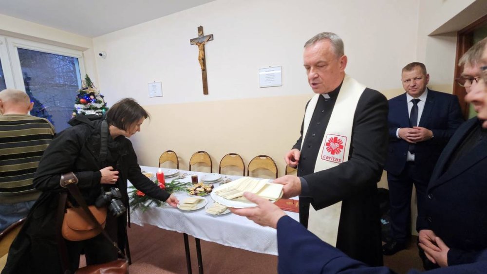 Zanim pensjonariusze domu i noclegowni zasiedli do wieczerzy wigilijnej wzajemnie składali sobie życzenia i łamali się opłatkiem. Życzenia wszystkim zebranym złożyli oprócz Dyrekcji Caritas: Jerzy Maślanka - dyrektor Domu oraz Dorota Krakowska - dyrektor Centrum Usług Społecznych w Tarnowie. Przy organizacji wigilii pomagali uczniowie z Zespołu Szkół Budowlanych w Tarnowie. Młodzi śpiewali i grali kolędy oraz podawali dania bezdomnym do stołu.